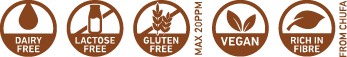 Für diese milchfreie Schokolade wurde die Milch durch eine 100 % pflanzliche Alternative ersetzt: Chufa. Die Chufa ist die Knolle der Pflanze Cyperus esculentus, die im Mittelmeerraum wächst. Nach der Ernte werden die Knollen getrocknet und gemahlen, um sie als leckeren und cremigen Milchersatz zu verwenden, der außerdem reich an Ballaststoffen ist.